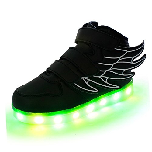 Aidonger® NEW SHOES COLLECTION STYLE mode High-top sneakers. Angel wing design. Keep warm and comfortable to wear, Modern sport style makes the wearer particularly welcome. You look very sport and cool, when you wear shoes with LED light. USB CHARGE 7 colors USB charge LED shoes, with 2-3 hours charging, it can support 8-10 hours of lighting. It can be charged by power bank, car charger or universal charger. FUNCTIONS 7 different colors in a pair (red green blue yellow turquoise, purple, white), there is switch button on each shoe, With which you could change the color. (Flashing, continuous lighting, approx. A dozen different colors). Charging cable with two charging options is included. This allows both shoes to be charged at the same time. MAINTENANCE ,it is weatherproof, can carry in rainy weather, but can not be immersed in water. Please pay attention to the maintenance. Wipe the leather with oil. Do not wash it with water. SIZE: Length(cm) 7(UK)/EU 25 ......16 8(UK)/EU 26 ......16.7 9(UK)/EU 27 ......17.4 10(UK)/EU 28 .....18 11(UK)/EU 29 ......18.7 12(UK)/EU 30 ......19.4 12.5(UK)/EU 31 ......20 13(UK)/EU 32 ......20.7 1(UK)/EU 33 ......21.4 2(UK)/EU 34 ..... 22 2.5(UK)/EU 35 ......22.7 3.5(UK)/EU 36 ......23.4 4(UK)/EU 37 ......24 * If your feet are thick or wide or you can not determine the size, please choose one size larger. * If you still have any question or requirement, please contact us. DELIVERY CONTENT 1*【A pair of shoes】 1*【USB-Cable】 1*【Shoe bag】