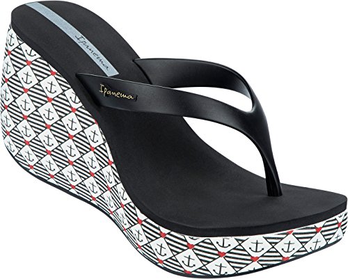 NEW FOR 2015!!! Add style and glamour to your summer collection with the Ipanema Lipstick II Wedge. This comfortable flip flop is designed with an eye catching nautical themed high wedge for a stylish look! Made out of 100% recyclable materials! Made in Brazil! Features a PVC moulded one-piece top strap for comfort. The Ipanema brand name features on the strap and on the EVA footbed. The height of the EVA patterned wedge is approximately 3 1/4" and the height of the platform is approximately 1". The textured rubber outsole provides grip.